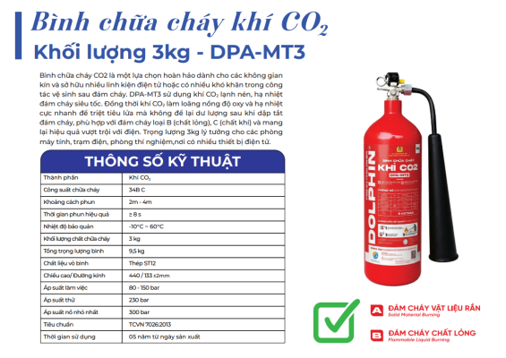 ình chữa cháy CO2 là một lựa chọn hoàn hảo dành cho các không gian kín và sở hữu nhiều linh kiện điện tử hoặc có nhiều khó khăn trong công tác vệ sinh sau đám cháy. DPA-MT3 sử dụng khí CO2 lạnh nén, hạ nhiệt đám cháy siêu tốc. Đồng thời khí CO2 làm loãng nồng độ oxy và hạ nhiệt cực nhanh để triệt tiêu lửa mà không để lại dư lượng sau khi dập tắt đám cháy, phù hợp với đám cháy loại B (chất lỏng), C (chất khí) và mang lại hiệu quả vượt trội với điện.